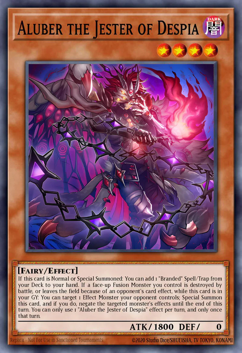 Si esta carta es Invocada de Modo Normal o Especial: puedes añadir a tu mano 1 Mágica/Trampa "Señalado/a" en tu Deck. Si un Monstruo de Fusión boca arriba que controlas es destruido en batalla, o deja el Campo por efecto de una carta del adversario, mientras esta carta está en tu Cementerio: puedes seleccionar 1 Monstruo de Efecto que controle tu adversario; Invoca esta carta de Modo Especial y, si lo haces, hasta el final de este turno niega los efectos del monstruo seleccionado. Sólo puedes usar 1 efecto de "Aluber el Bufón de Despía" por turno, y sólo una vez ese turno.