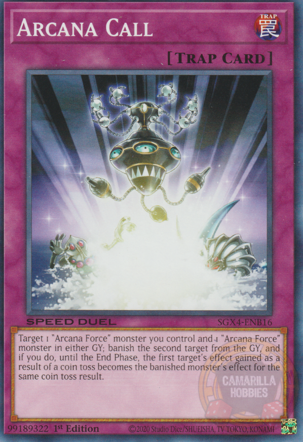 Selecciona 1 monstruo "Fuerza Arcana" que controles. Retira del juego 1 monstruo "Fuerza Arcana" del Cementerio de cualquier jugador. Hasta la Fase Final, el efecto del monstruo seleccionado se convierte en el efecto del monstruo eliminado para el mismo resultado del lanzamiento de moneda.