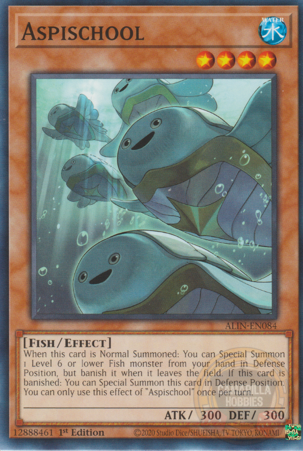 Cuando esta carta es Invocada de Modo Normal: puedes Invocar de Modo Especial, desde tu mano, 1 monstruo Pez de Nivel 6 o menor en Posición de Defensa, pero destiérralo cuando deje el Campo. Si esta carta es desterrada: puedes Invocar esta carta de Modo Especial en Posición de Defensa. Sólo puedes usar este efecto de "Aspisbanco" una vez por turno.