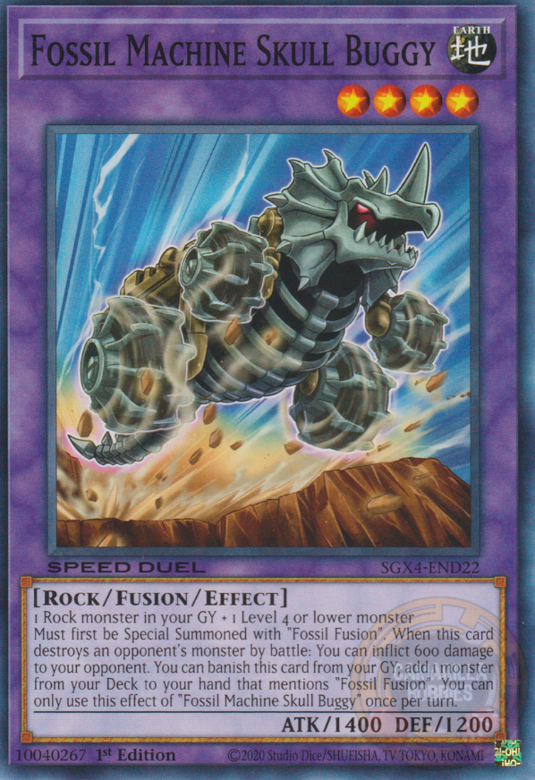 Primero debe ser Invocado de Modo Especial con "Fossil Fusion". Cuando esta carta destruye un monstruo de tu adversario en batalla: puedes infligir 600 puntos de daño a tu adversario. Puedes desterrar esta carta en tu Cementerio; añade a tu mano 1 monstruo en tu Deck que mencione "Fusión Fósil". Sólo puedes usar este efecto de "Fossil Machine Skull Buggy" una vez por turno.