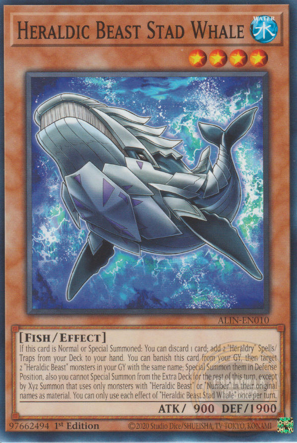 Si esta carta es Invocada de Modo Normal o Especial: puedes descartar 1 carta; añade a tu mano 2 Mágicas/Trampas "Heráldico/a" en tu Deck. Puedes desterrar esta carta en tu Cementerio, y después selecciona 2 monstruos "Bestia Heráldica" en tu Cementerio con el mismo nombre; Invócalos de Modo Especial en Posición de Defensa, y además no puedes Invocar de Modo Especial desde el Deck Extra por el resto de este turno, excepto con una Invocación Xyz que sólo como material use monstruos con "Bestia Heráldica" o "Número" en sus nombres originales. Sólo puedes usar cada efecto de "Bestia Heráldica Ballena Stad" una vez por turno.