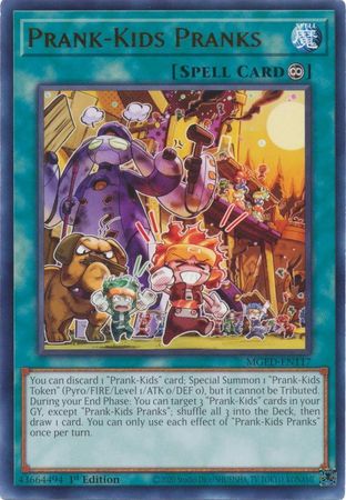 Puedes descartar 1 carta "Prank-Kids"; Invoca de Modo Especial 1 "Ficha de Broma para Niños" (Pyro/FUEGO/Nivel 1/ATK 0/DEF 0), pero no puede ser Sacrificada. Durante tu End Phase: puedes seleccionar 3 cartas de "Niños Bromistas" en tu Cementerio, excepto "Bromas de Niños"; baraja los 3 en el mazo, luego roba 1 carta. Sólo puedes usar cada efecto de "Bromas de los Niños" una vez por turno.