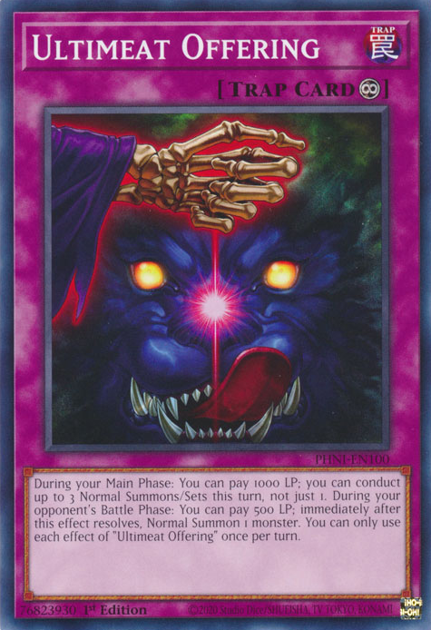Durante tu Main Phase: puedes pagar 1000 LP; puedes realizar hasta 3 Invocaciones Normales/Colocaciones este turno, no sólo 1. Durante la Battle Phase de tu adversario: puedes pagar 500 LP; inmediatamente después de que se resuelva este efecto, Invoca 1 monstruo de Modo Normal. Sólo puedes usar cada efecto de "Ofrenda Carfinitiva" una vez por turno.