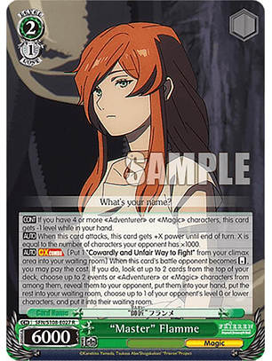 [AUTO] Cuando esta carta se coloque en el escenario desde tu mano, revela la carta superior de tu mazo. Si esa carta es "Magia que Subyuga a los Oponentes" o un personaje "Aventurero" o "Mágico", puedes elegir uno de los personajes de nivel 0 o inferior de tu oponente y ponerlo en su sala de espera. (Devuelve la carta revelada a su lugar original)