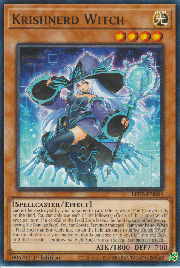 No puede ser destruido por efectos de cartas de tu adversario mientras "Multi-Universo" está en el Campo. Sólo puedes usar cada uno de los siguientes efectos de "Bruja Krishnerd" una vez por turno. Si una o más cartas en la Zona del Campo dejan el Campo por el efecto de una carta (excepto durante el Damage Step): puedes Invocar esta carta de Modo Especial desde tu mano. Cuando una Mágica de Campo que ya está boca arriba en el Campo activa su efecto (Efecto Rápido): puedes barajar al Deck 1 de tus monstruos que esté desterrado o en tu Cementerio o, si ese monstruo menciona esa Mágica de Campo, puedes Invocarlo de Modo Especial en su lugar.