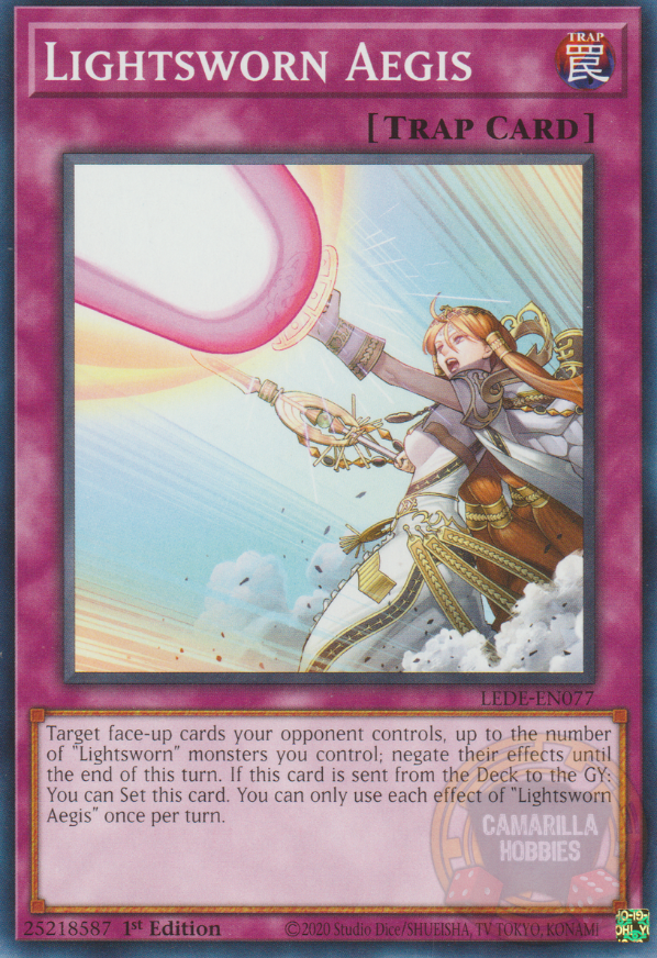 Selecciona cartas boca arriba que controla tu adversario, hasta el número de monstruos "Luminoso/a" que controlas; niega sus efectos hasta el final de este turno. Si esta carta es mandada del Deck al Cementerio: puedes Colocar esta carta. Sólo puedes usar cada efecto de "Égida Luminosa" una vez por turno.