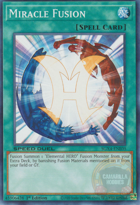 Invoca por Fusión 1 Monstruo de Fusión "HÉROE Elemental" desde tu Deck Extra, desterrando los Materiales de Fusión mencionados en él de tu campo o Cementerio.
